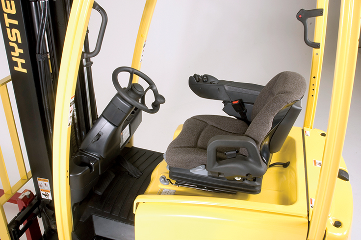 On/off access and driving in reverse causes less fatigue over long shifts. The steering column is infinitely adjustable via adjustable gas spring support and optional height adjustment is also available. The memory tilt option allows the steering column to be released to the most vertical position to allow the operator to get off the truck easily. When returning to the cab, the operator simply pulls the steer column back to the pre-set position.