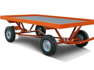 Also standard are semi-pneumatic tires (for smooth surfaces), and a wood deckboard. Optional features include solid steel sides and stake sides for containing large loads.