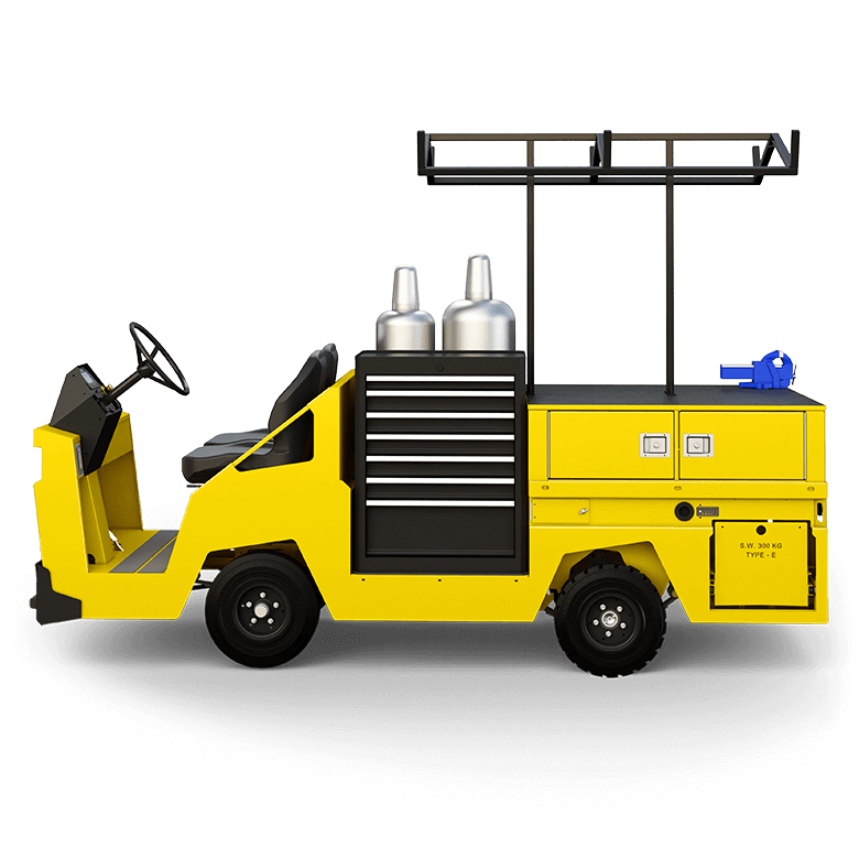 Console on steering column, bolt-on front bumper, DC/DC converter to equalize battery cells, LED charge indicator, full-sized 7-drawer tool chest, 3 lockable compartments, ladder/pipe racks, extinguisher, vice |